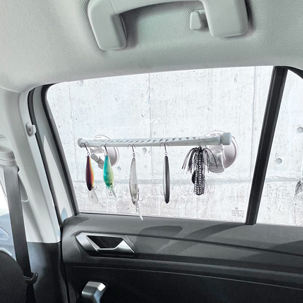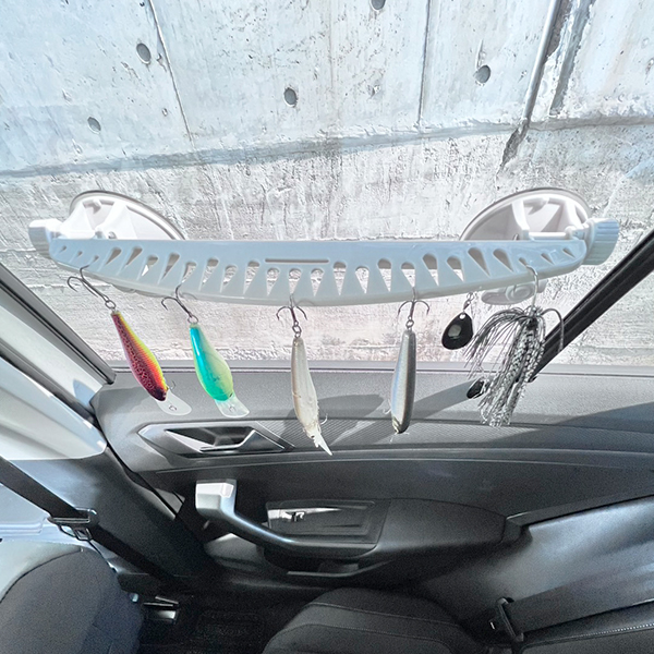 両サイドの吸盤で壁面に取付できるプラスチック製ルアーホルダー。