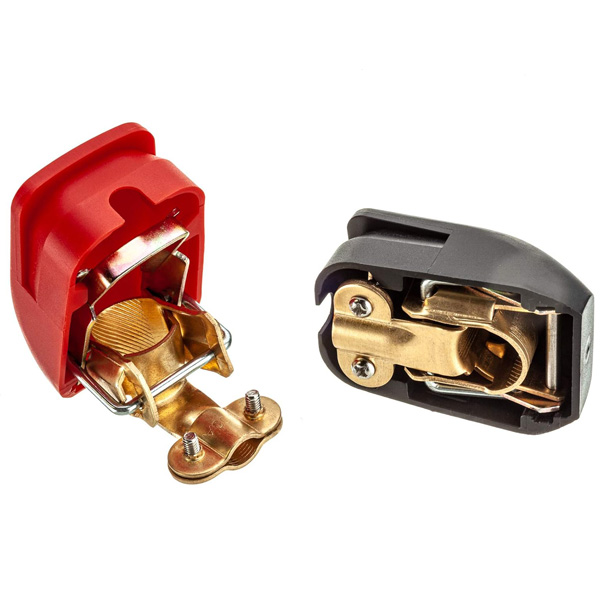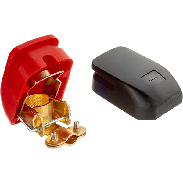 バッテリーの配線接続に便利な(+)コネクターと(-)コネクターのセットです。 しっかりと、しかも簡単に接続ができ上部がプラスチック製ですので絶縁性も高く安全です。 コネクターと配線の接続は、プレートの凹凸両面を使い分ける事で細い配線からセルモーター(スターター)等の太い配線まで接続可能です。 プレートは固定ネジをプラスドライバーを使って簡単に取り外しできますが、配線接続の際は緩まないよう確実に締め付けをして下さい。 緩みが生じますと火災等の思わぬ事故が発生する可能性がございますのでご注意願います。 また、場合によってはハンダ付けをする事をお勧めいたします。 ※注意:バッテリーターミナルの先端にスタッドが付いているタイプのバッテリーには使用できません。 ■ 外寸法:縦 68mm x 横 47mm x 高さ30mm(閉じた状態) ■ バッテリー端子:太テーパー(大ポール)用 ■ ターミナル規格 :C~H に適合(A及びB は使用不可) ■ DC12V用 耐電流 MAX 800A ■ 適用電線:1~14AWG ■ 材質:カバー;ABS樹脂 ターミナル接合部;金メッキ