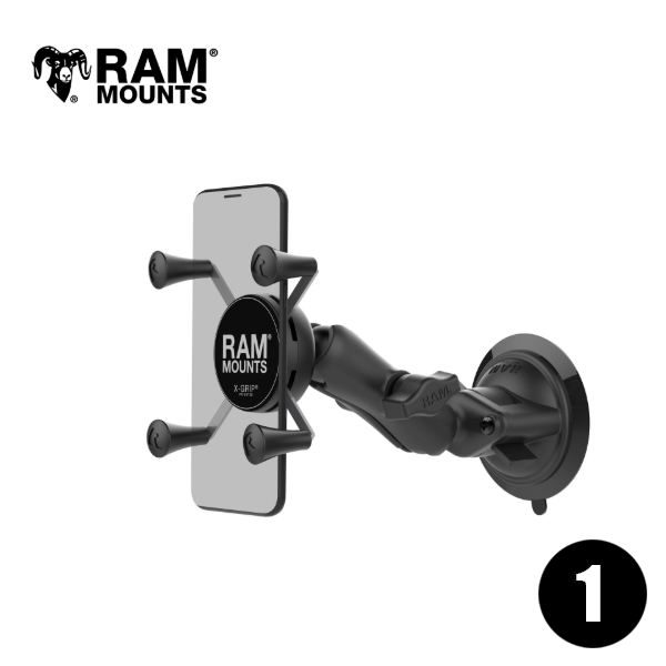 直径 3.3 インチの RAM Twist-Lock吸盤ベース、中程度の長さのダブル ソケット アーム、人気のスプリング式 RAM X-Grip スマホホルダーで構成されています。