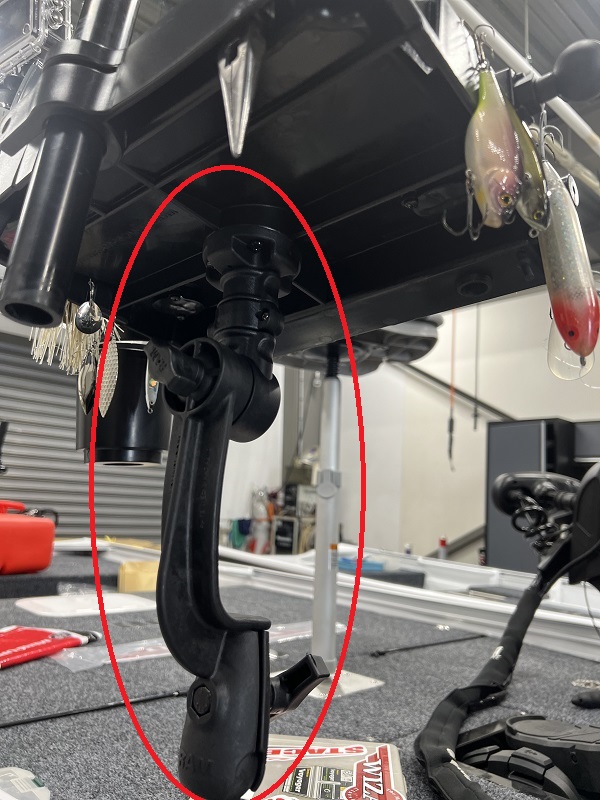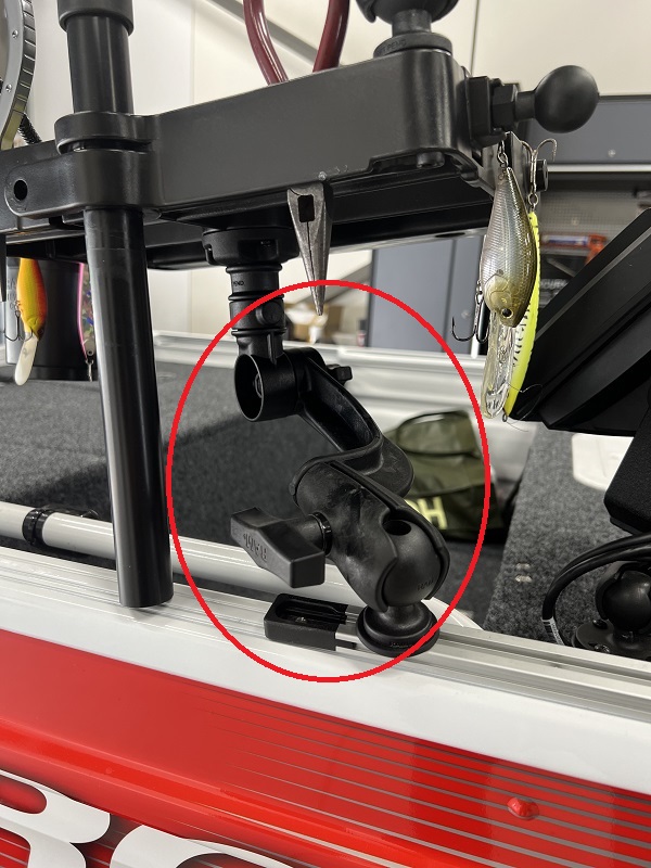 デバイス取付けマウント側はクイックリリーススプラインポストベースとなっており、スプラインポストタイプのロッドホルダーやベイトボード、ボールマウントが取付可能
