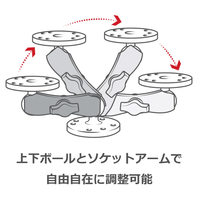 1インチボール用ミディアムダブルソケットアーム(品番:708201)と、直径62mmのラウンドベース(品番:708202)2つがセットになった商品です。