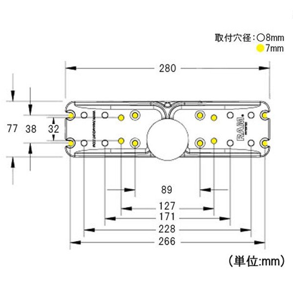 ユニバーサルトップには及びませんが、こちらの製品にも魚群探知機、GPSソナーなど、様々な機器が取り付け可能な多くの取付穴があり、汎用性の高いトップパーツになっています。また、1.5インチボール用に比べ、大型機器の取付も可能です。