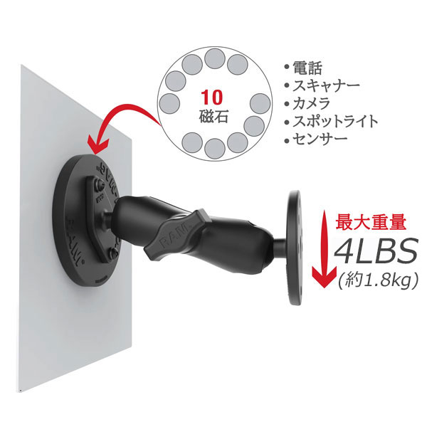 ※マグネット自体の耐荷重には強度が有りますが、1"のボールジョイント部分の耐荷重は最大4LBS(約1.8Kg)となります。